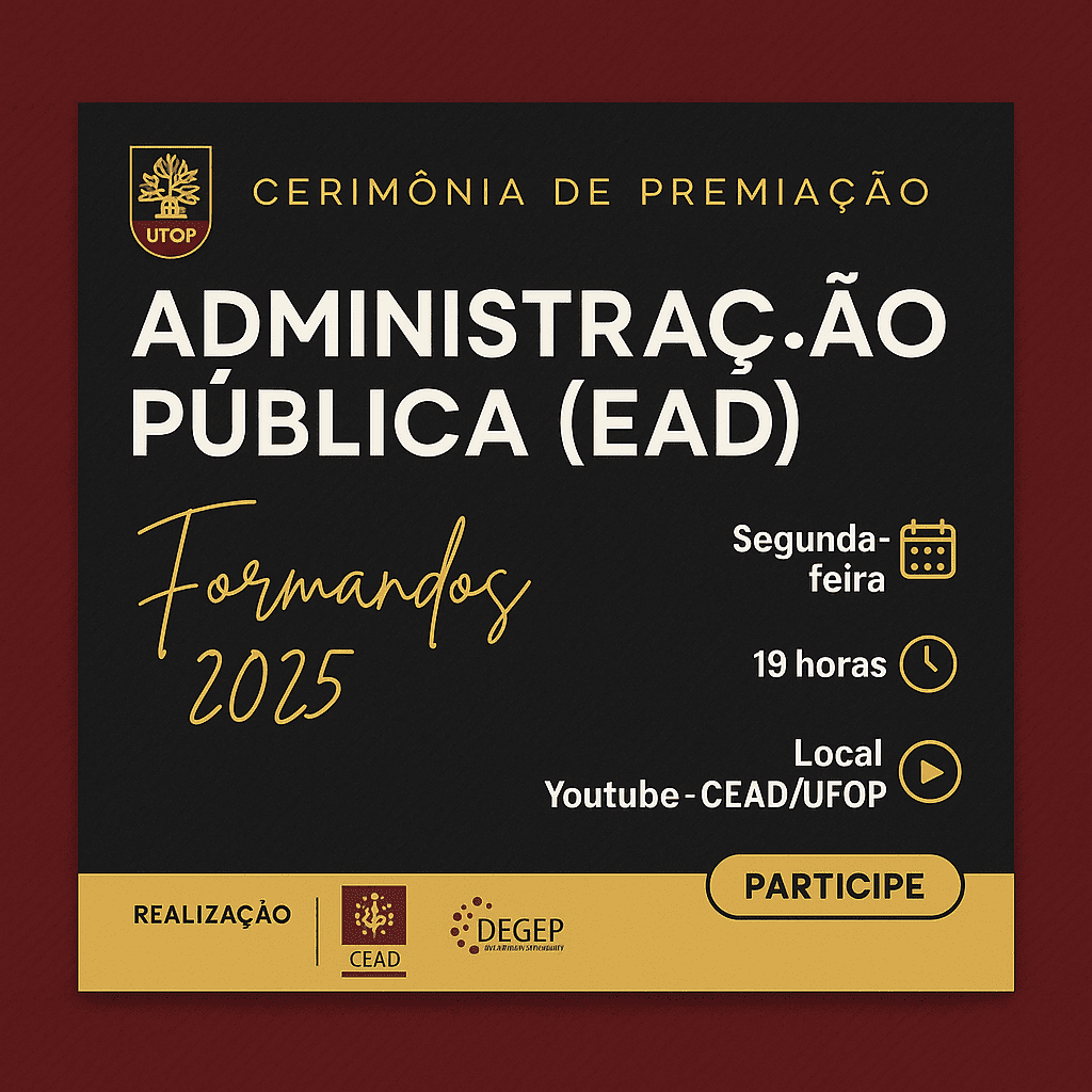 A cerimônia será transmitida ao vivo no canal do CEAD/UFOP no Youtube: https://www.youtube.com/live/6AJ09x3FrVE?si=oGn8dt7_gDFNe7Sm